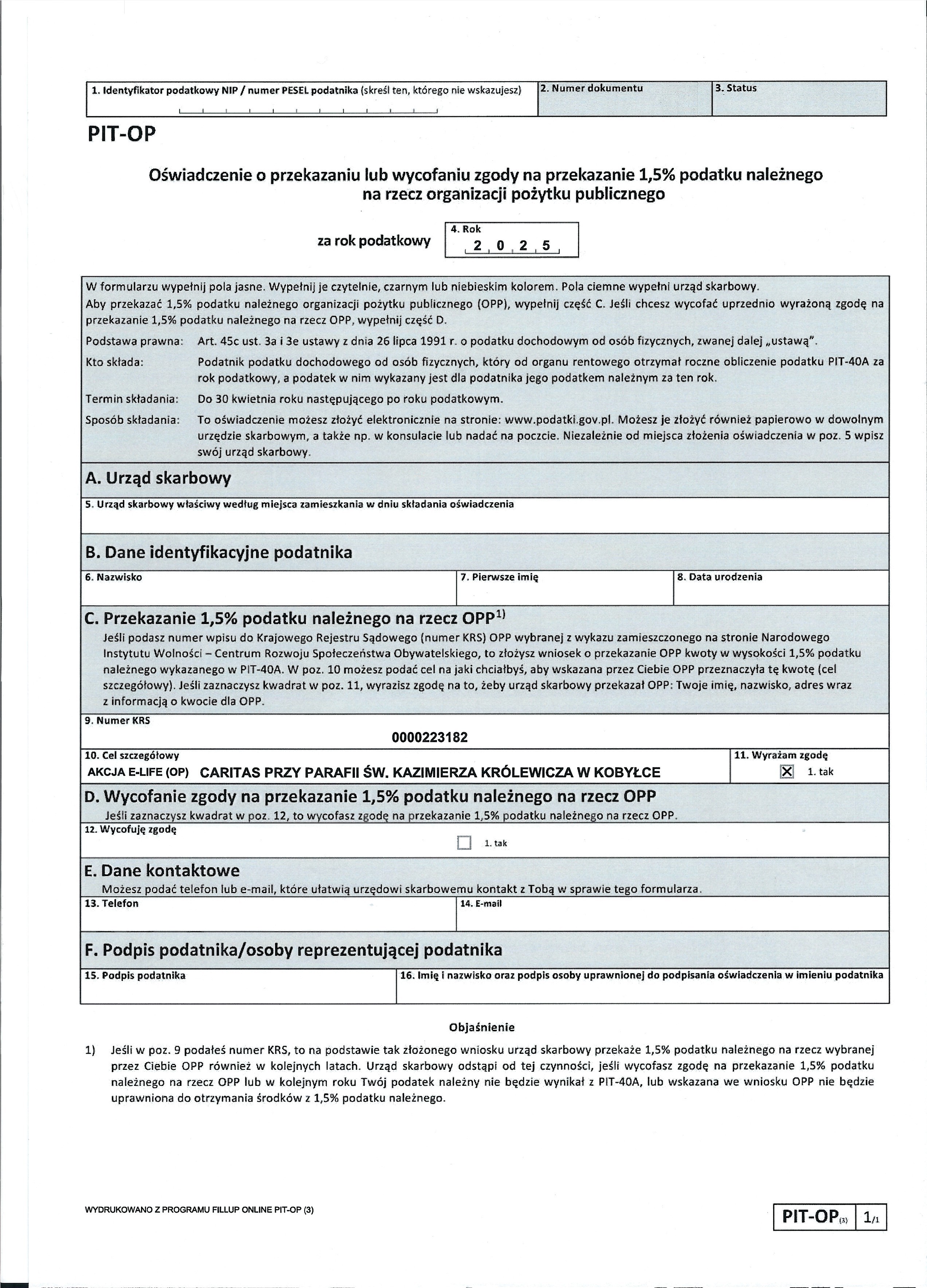 Prosimy o przekazanie 1,5% podatku na rzecz Parafialnego Zespołu CARITAS naszej Parafii